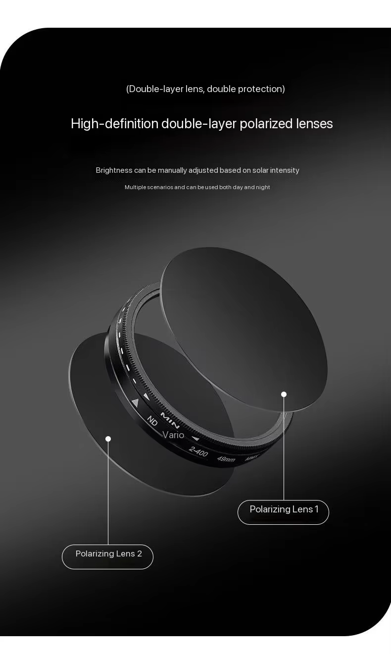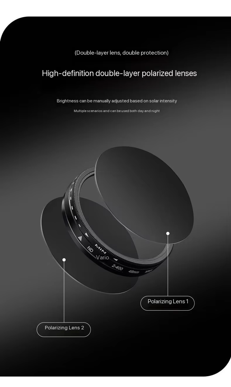 • Filter : ND9-speed adjustable light reduction, UV protection