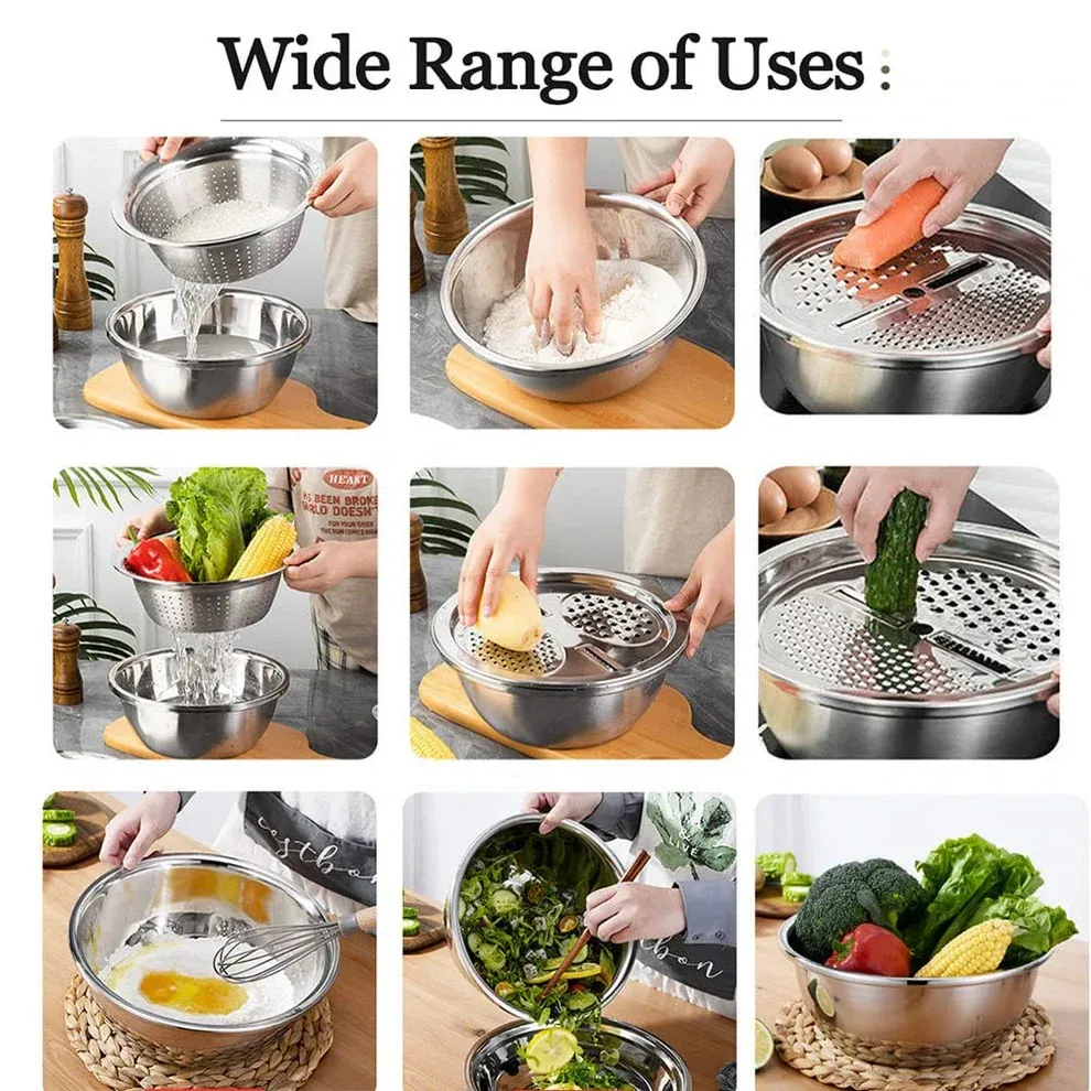 Product Name - 3 in 1 Multifunctional Grater Basin Stainless Steel Colanders Set Basin with Grater Strainer and Drain Basket for Kitchen Washing Vegetables.