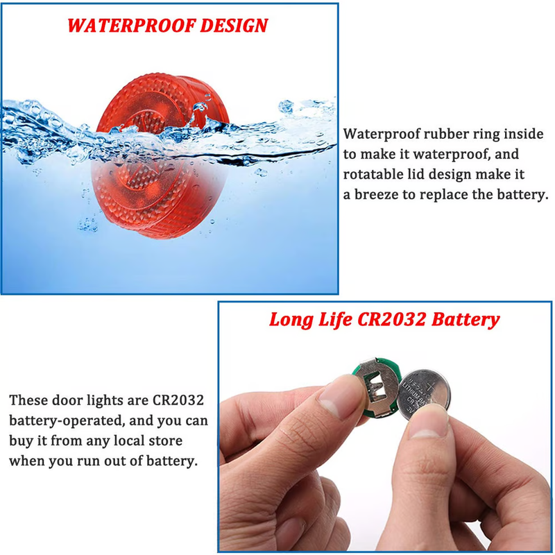 - [Small size and strong water resistance]: Our LED warning lights are compact in design and fit perfectly to the edge of the door, without any influence on opening/closing the door. The lampshade adopts a fully sealed design, which can work even in rainy days.