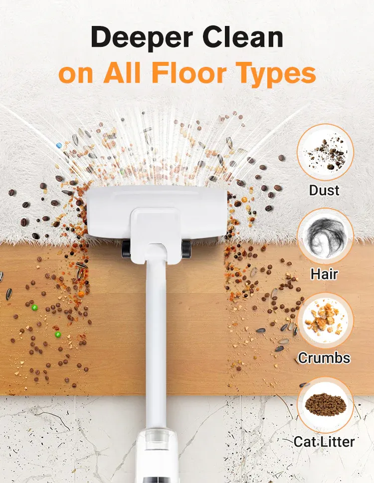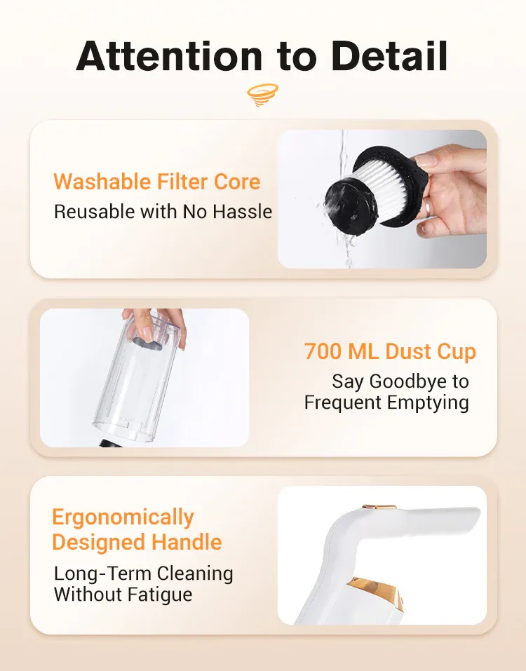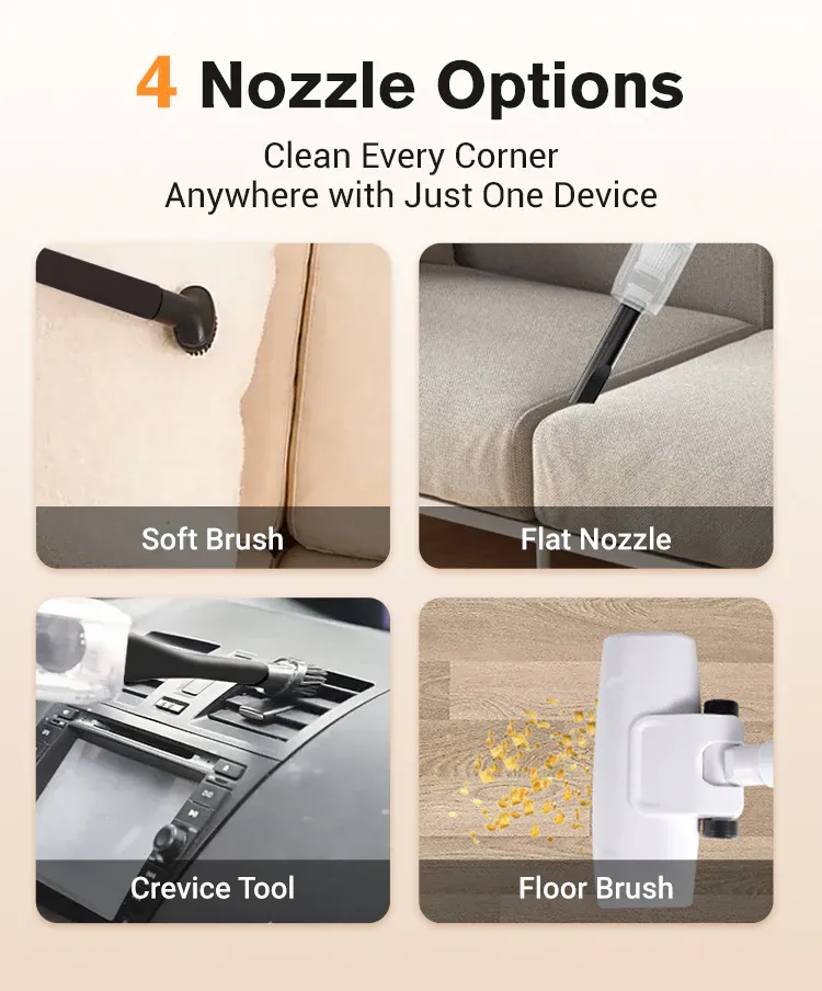 120W high-power motor and 8500pa super suction, you can easily clean up dirt, dust and debris from carpets, upholstery and hard surfaces. 3 brush heads can be wiped and vacuumed to meet all your cleaning needs. Suitable for picking up crumbs After dinner, you can comb hair strands in the bathroom, or quickly freshen floors before guests arrive.