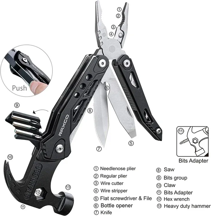 The 14 in 1 multi tools survival tools set including Magnetic Bit Hanging Hole,hammer,Knife,Saw,Can opener,Large and small hexagon wrenches,Corkscrew,Clamp,Strong pliers,Cutting pliers,Screwdriver head,Nail puller,Wire cutting pliers,Corkscrew,Can opener and more. All little power tools not only could be folded easily, but also be a great Gift for dad, Handyman, Men or Women in Father's Day, Birthdays, Christmas and Thanksgiving day.